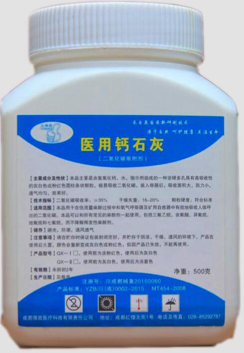 钙石灰:又名二氧化碳吸收剂。产品主要由氢氧化钙、水、指示剂组成,不含钾等强碱物质。产品是一种坚硬多孔、具有高吸收性的颗粒状物品。与其他制剂相比,钙石灰的最大优点是不含强碱性氢氧化钠和氢氧化钾,有助于消除一氧化碳和肾毒性复合物A( compound A)生成,降低或消除呼吸回路起火的可能性。钙石灰主要缺点是:①吸收效率差,较强碱性吸收剂吸收效率降低约50%; ②价格较昂贵。